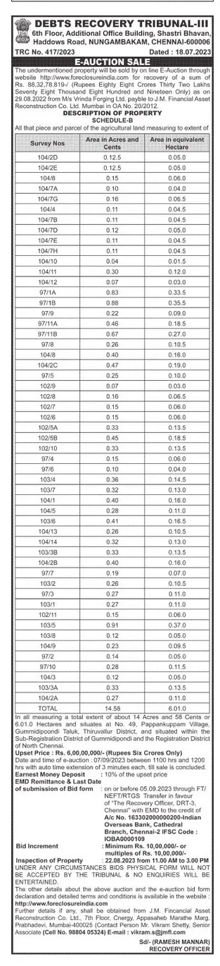 | Schedule of Property: | All that piece and parcel of the agricultural land measuring to extent of In all measuring a total extent of about 14 Acres and 58 Cents or 6.01.0 Hectares and situates at No 49. Pappankuppam Village Gummidipoondi Taluk, Thiruvallur District and situated within the Sub-Registration District of Gummidipondi and the Registration District of North Chennai |