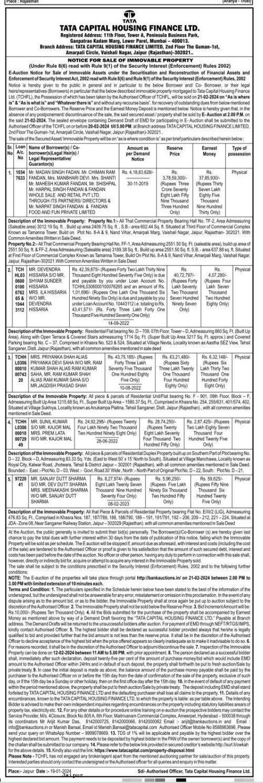 | Contact Details: | Contact The Authorized Officer: Manish Bansal Email id Manish.Bansal@tatacapital.com 8588983696, 999078669 |