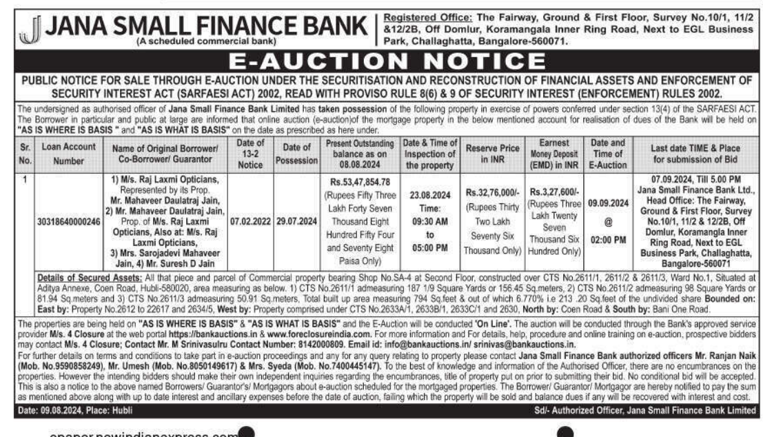 | Contact Details: | Contact The Authorized Officer: Mr.Ranjan Naik, Mobile No. 6362951653, Mr. Umesh (Mob. No.8050149617) & Mrs. Syeda (Mob. No.7400445147). |