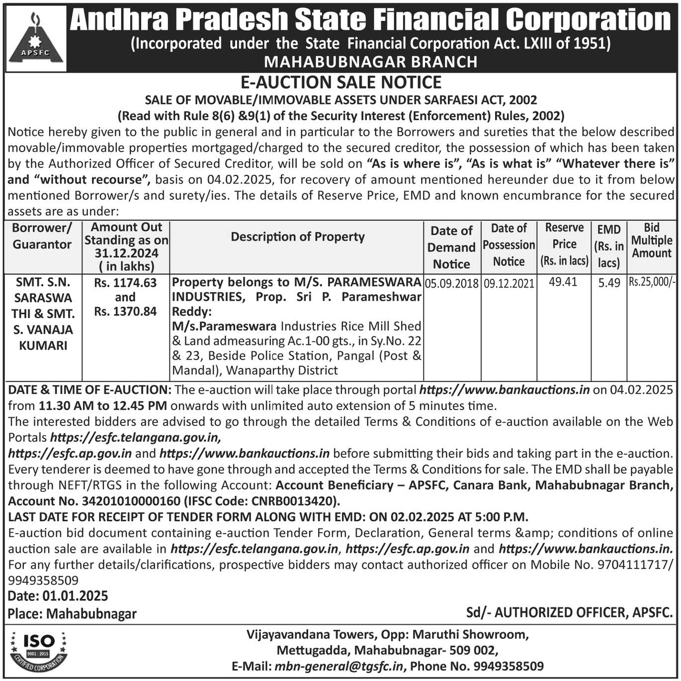| End Date and Time of Auction: | 04-02-2025 12:45 pm |