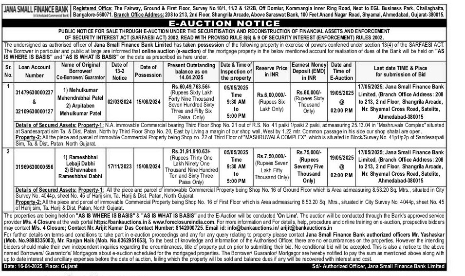 | Schedule of Property: | Property-1: All the piece and parcel of immovable Commercial Property being Shop No. 16 of Ground Floor which is Area admeasuring 8.53.20 Sq. Mtrs., situated in City Survey No. 4044p, sheet No. 45 of Harij sim, Ta. Harij & Dist. Patan, North Gujarat.Property-2: All the piece and parcel of immovable Commercial Property being Shop No. 16 of First Floor which is Area admeasuring 8.53.20 Sq. Mtrs., situated in City Survey No. 4044p, sheet No. 45 of Harij sim, Ta. Harij & Dist. Patan, North Gujarat. |