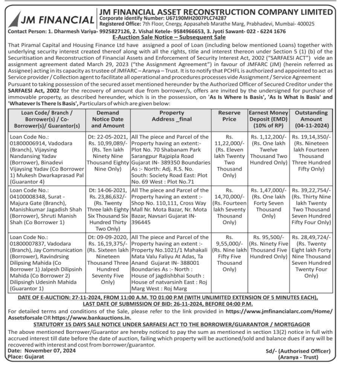 | Contact Details: | Contact The Authorized Officer: 1. Dharmesh Variya-9925827126, 2. Vishal Ketele-9584966653, 3. Jyoti Sawant-022-6224 1676 |