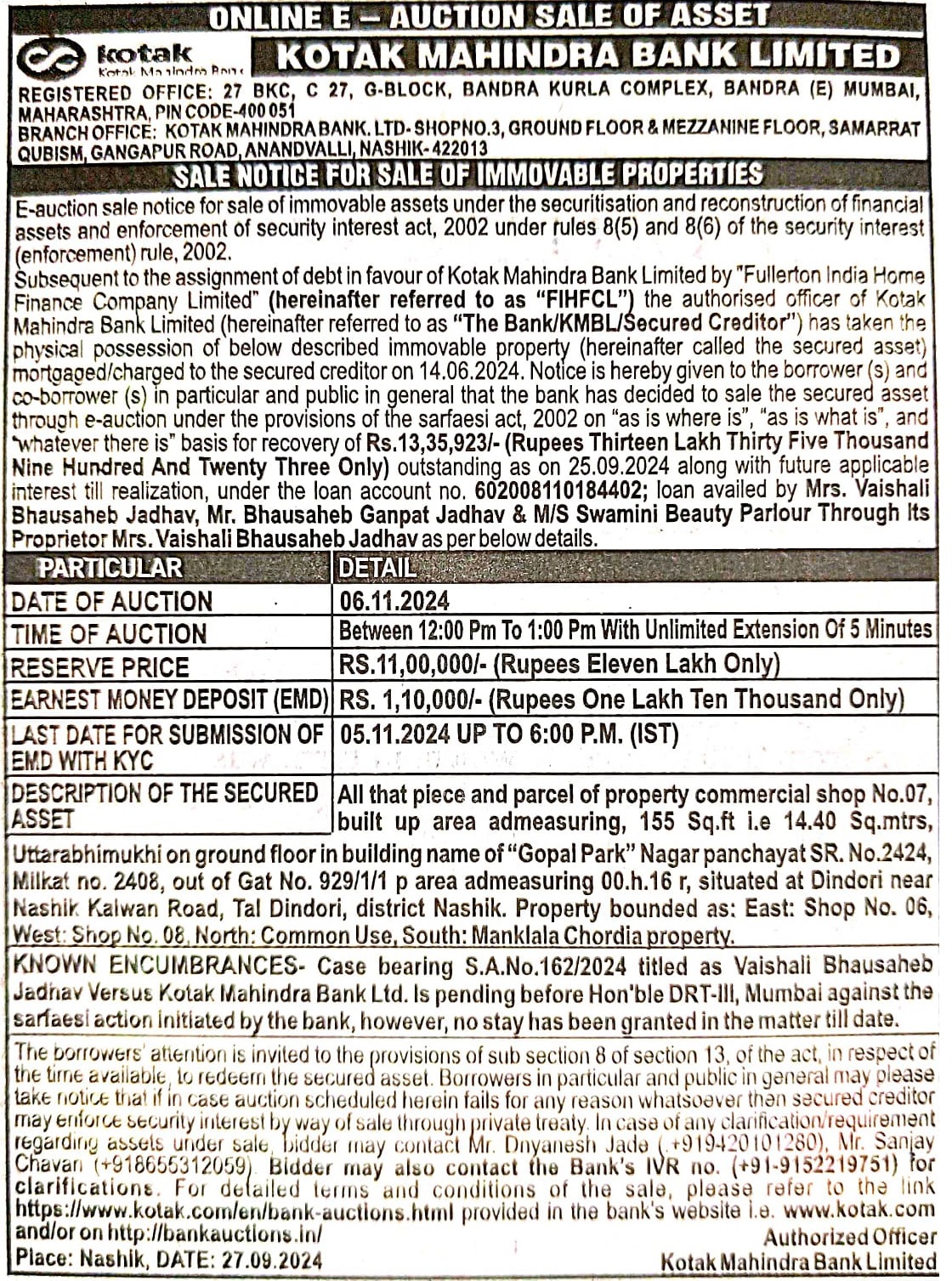 | Contact Details: | Contact The Authorized Officer ; Mr. Dnyanesh Jade (.+919420101280), Mr. Sanjay Chavan (+918655312059) |
