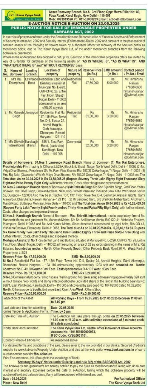 | Contact Details: | Contact The Authorized Officer : Mr. Himanshu Ranjan - 7765046680 himanshuranjan@kvbmail.com |