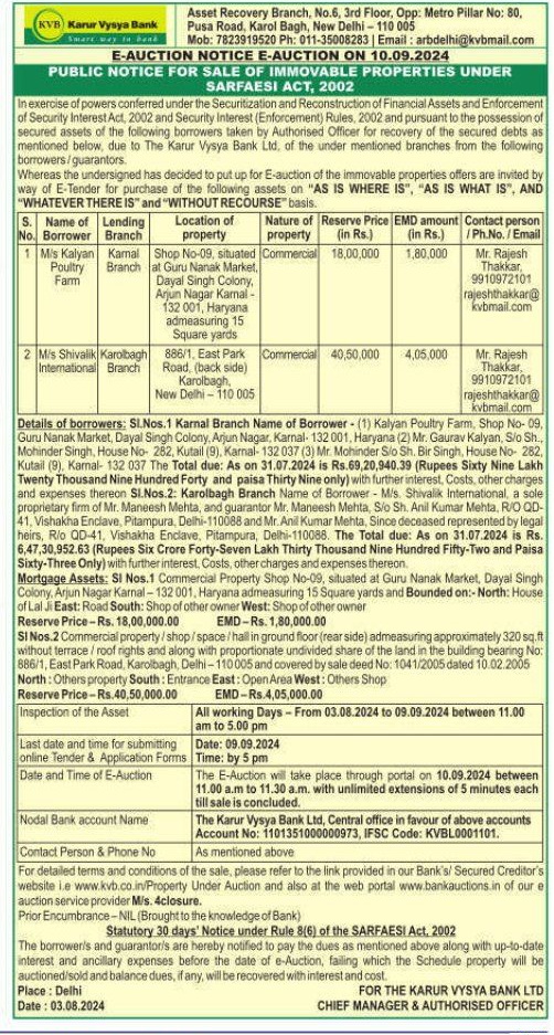 | Schedule of Property: | Mortgage Assets: SI Nos.1 Commercial Property Shop No-09, situated at Guru Nanak Market, Dayal Singh Colony, Arjun Nagar Karnal 132 001. Haryana admeasuring 15 Square yards and Bounded on:- North: House of Lal J East: Road South: Shop of other owner West: Shop of other owner |