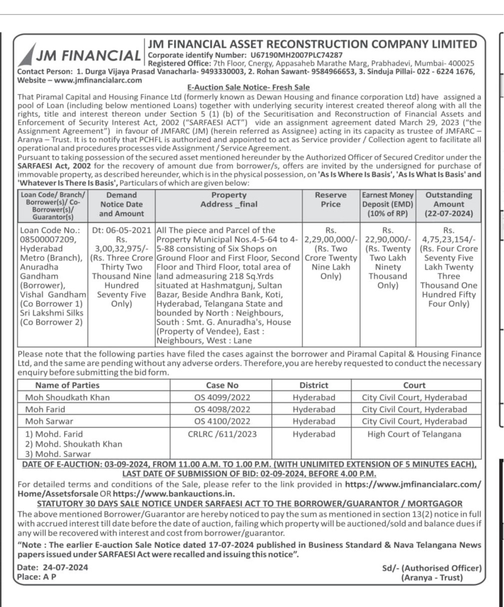 | Contact Details: | Contact The Authorized Officer:Contact Person: 1. Durga Vijaya Prasad Vanacharla- 9493330003, 2. Rohan Sawant-9584966653, 3. Sinduja Pillai-022-6224 1676,Website - www.jmfinancialarc.com |