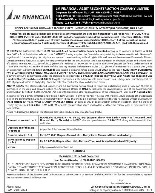 | Schedule of Property: | All That piece and parcel of shop no 46 on lower ground floor in commercial apartment as named Gurupragya sankalp tower situtated at commerical converted plot no 7, 8, 40, & 41, scheme no k-s Sirsi raod jaipur pin-302012 admeasuring 13.00.00 sqft buildup |