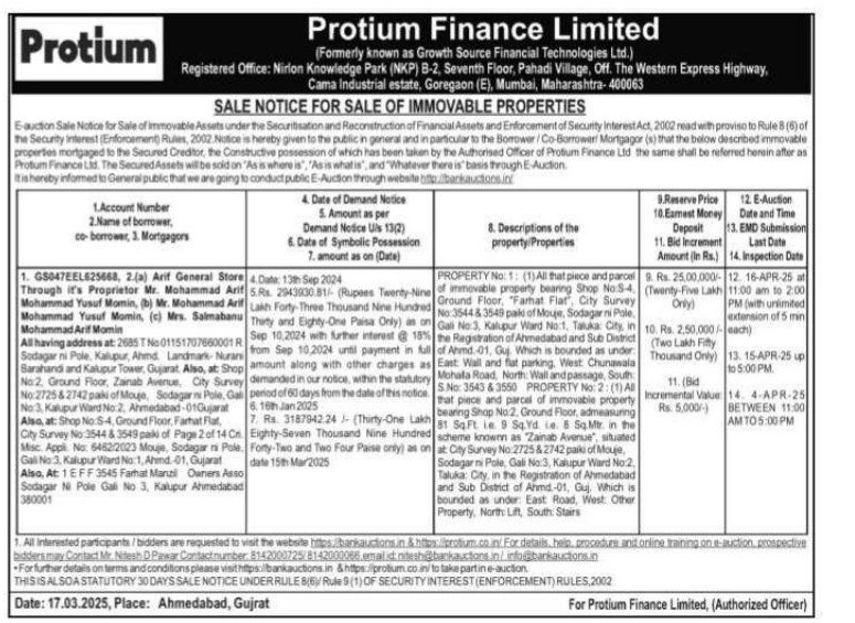 | Schedule of Property: | PROPERTY No: 1: (1) All that piece and parcel of immovable property bearing Shop No.S-4. Ground Floor, "Farhat Flat, City Survey No: 3544 & 3549 paki of Mouje, Sodagar ni Pole, Gal No: 3, Kalupur Ward No.1, Taluka City, in the Registration of Ahmedabad and Sub District of Ahmd.-01, Guj. Which is bounded as under: East: Wall and flat parking. West Chunawala Mohalla Road, North: Wall and passage, South S.No S.No: 3543 & 3550 PROPERTY No: 2: (1) All that piece and parcel of immovable property bearing Shop No.2, Ground Floor, admeasuring 81 Sq.Ft. le 9 Sq.Yd. ie. 8 Sq.Mtr. in the scheme known as "Zainab Avenue", situated at City Survey No 2725 & 2742 paiki of Mouje, Sodagar ni Pole, Gali No:3, Kalupur Ward No:2. Taluka: City, in the Registration of Ahmedabad and Sub District of Ahmd-01, Guj. Which is bounded as under: East Road, West: Other Property, North: Lift, South: Stairs |