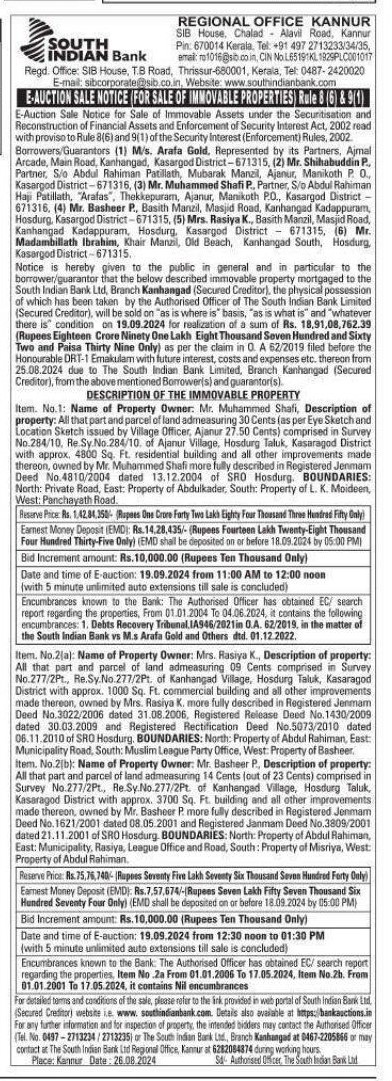 | Schedule of Property: | Item No 2(a): Name of Property Owner: Mrs Rasiya K. Description of property:All that part and parcel of land admeasuring 09 Cents comprised in Survey No b.277/2Pt. Re.Sy.No.277/2Pt. of Kanhangad Village, Hosdurg Taluk, Kasaragod District with approx. 1000 Sq Ft. commercial building and all other improvements made thereon, owned by Mrs Rasiya more fully described in Registered Jenmam Deed No 3022/2006 dated 31.08.2006 Registered Release Deed No 1430/2009 dated 30.03.2009 and Registered Rectification Deed No 5073/2010 dated 06.11.2010 of SRO Hosdurg BOUNDARIES: North: Property of Abdul Rahiman East Municipality Road South: Muslim League Party Office West Property of Basheer.Item No 2(b): Name of Property Owner: Mr. Basheer P., Description of property:All that part and parcel of land admeasuring 14 Cents (out of 23 Cents) comprised in Survey No 277/2Pt., Re.Sy.No.277/2Pt. of Kanhangad Village, Hosdurg Taluk, Kasaragod District with approx 3700 Sq. Ft. building and all other improvements made thereon, owned by Mr. Basheer P. more fully described in Registered Jenmam Deed No 1621/2001 dated 08.05.2001 and Registered Janmam Deed No 3809/2001 dated 21.11.2001 of SRO Hosdurg. BOUNDARIES: North Property of Abdul Rahiman, East: Municipality Rasiya, League Office and Road, South: Property of Misriya, West Property of Abdul Rahiman |