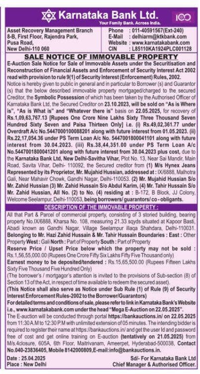 | Inspection Details: | Property Inspection Contact The Authorized Officer : 011-40591567, E-Mail : delhiarm@ktkbank.com |