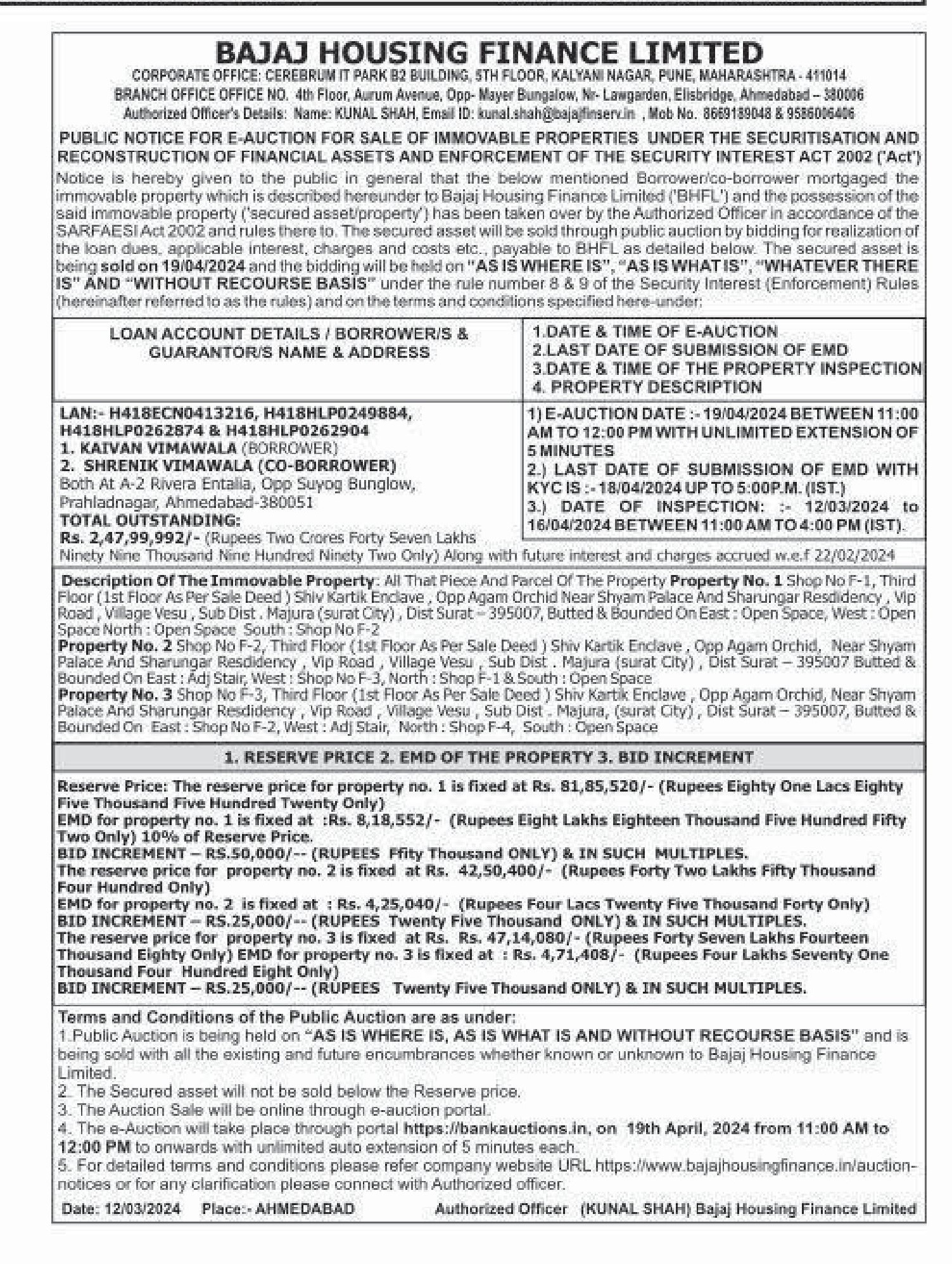| Contact Details: | Contact Authorized Officer : Kunal Shah Mob.No.:8669189048 , 9586016406 |