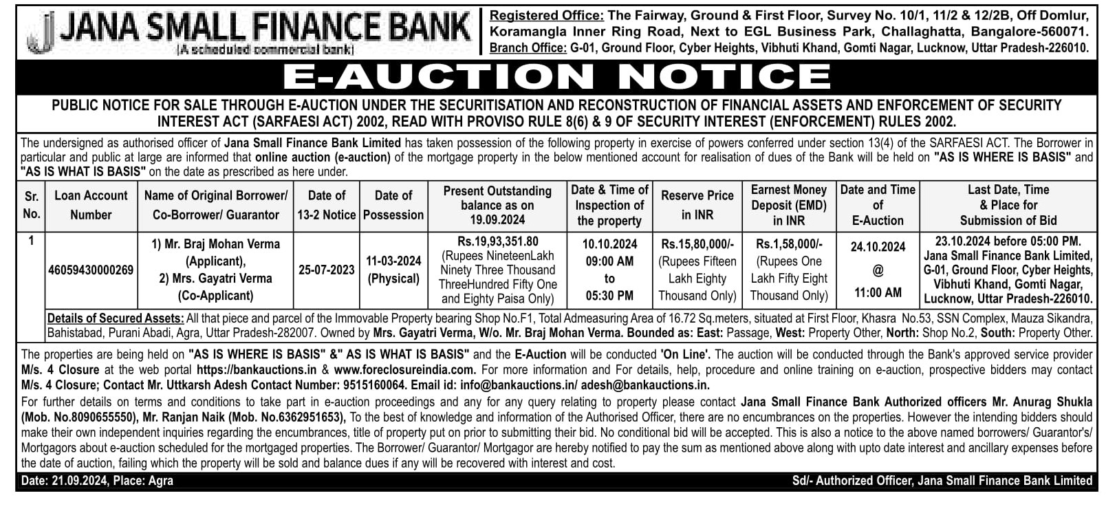 | Schedule of Property: | Details of Secured Assets: All that piece and parcel of the Immovable Property bearing Shop No.F1, Total Admeasuring Area of 16.72 Sq.meters, situated at First Floor, Khasra No.53, SSN Complex, Mauza Sikandra, Bahistabad, Purani Abadi, Agra, Uttar Pradesh-282007. Owned by Mrs. Gayatri Verma, W/o. Mr. Braj Mohan Verma. Bounded as: East: Passage, West: Property Other, North: Shop No.2, South: Property Other. |