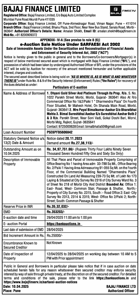 | Schedule of Property: | All That Piece and Parcel of Immoveable Property Comprising of Office Bearing No 1 having Area adm 33-788 Sq Mt., Office Bearing No. 2/Paiki 1 Having Area Admeasuring 91-055 Sq Mt. on the Fourth Floor, of the Commercial Building Named "Dharmendra Plaza" Constructed On Land Ad Measuring 239-73 Sq Mt. of Lekh No 173 Laying & Situated at City Survey No 2316 of City Survey Ward No. 3 of Sheet No 218 of Morbi City And District Bounded As: Office 1: East- Road, West- Common Stair, Passage & Shutter, North;-Property of City Survey No. 2315, South :- Road Office 2: East-City Survey No 2313, 2314 & 2315; West- Office No 2/Paiki 2; North-Street; South-Common Passage & Shutter |