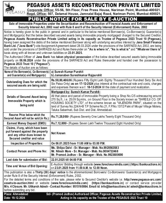 | Schedule of Property: | All that piece and parcel of immovable Property being a Shop No.C/5 admeasuring around 270 Sq.ft. i.e. 25.09 Sq.mtrs. on Ground Floor in the Society known as "SHREEJI CO. OP. HOUSING SOCIETY LTD". of the scheme known as "VAJENDRA PARK" situated on the land of Survey No.224/A B T.P Scheme No.21, F.P.No. 137/2 Paiki of Mouje/ Village Motera, Taluka Sabarmati, Sub Dist. and Dist. Ahmedabad. |