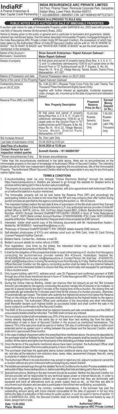 | Schedule of Property: | All that piece and parcel of property being Shop Nos 4,5,6,8,11,12 and 13 collectively ad measuring 1539.43 SQ ft carpet area on the Ground Floor in 'G' building known as M. P Square S.No. 64 Hissa No 14,18 to 22 Village Marunji, Taluka Mulshi. District Pune, Maharashtra -411057 |
