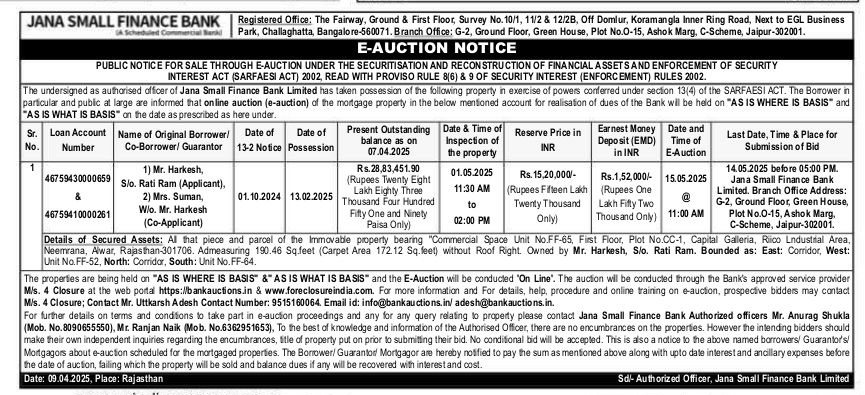 | Schedule of Property: | All that piece and parcel of the Immovable property bearing "Commercial Space Unit No.FF-65 First Floor Plot No CC-1, Capital Galleria, Rico Lndustrial Area, Neemrana, Alwar, Rajasthan-301706. Admeasuring 190.46 Sq.feet (Carpet Area 172.12 Sq.feet) without Roof Right Owned by Mr. Harkesh S/o. Rati Ram. Bounded as: East: Corridor, West: Unit No.FF-52. North: Corridor, South: Unit No.FF-64. |
