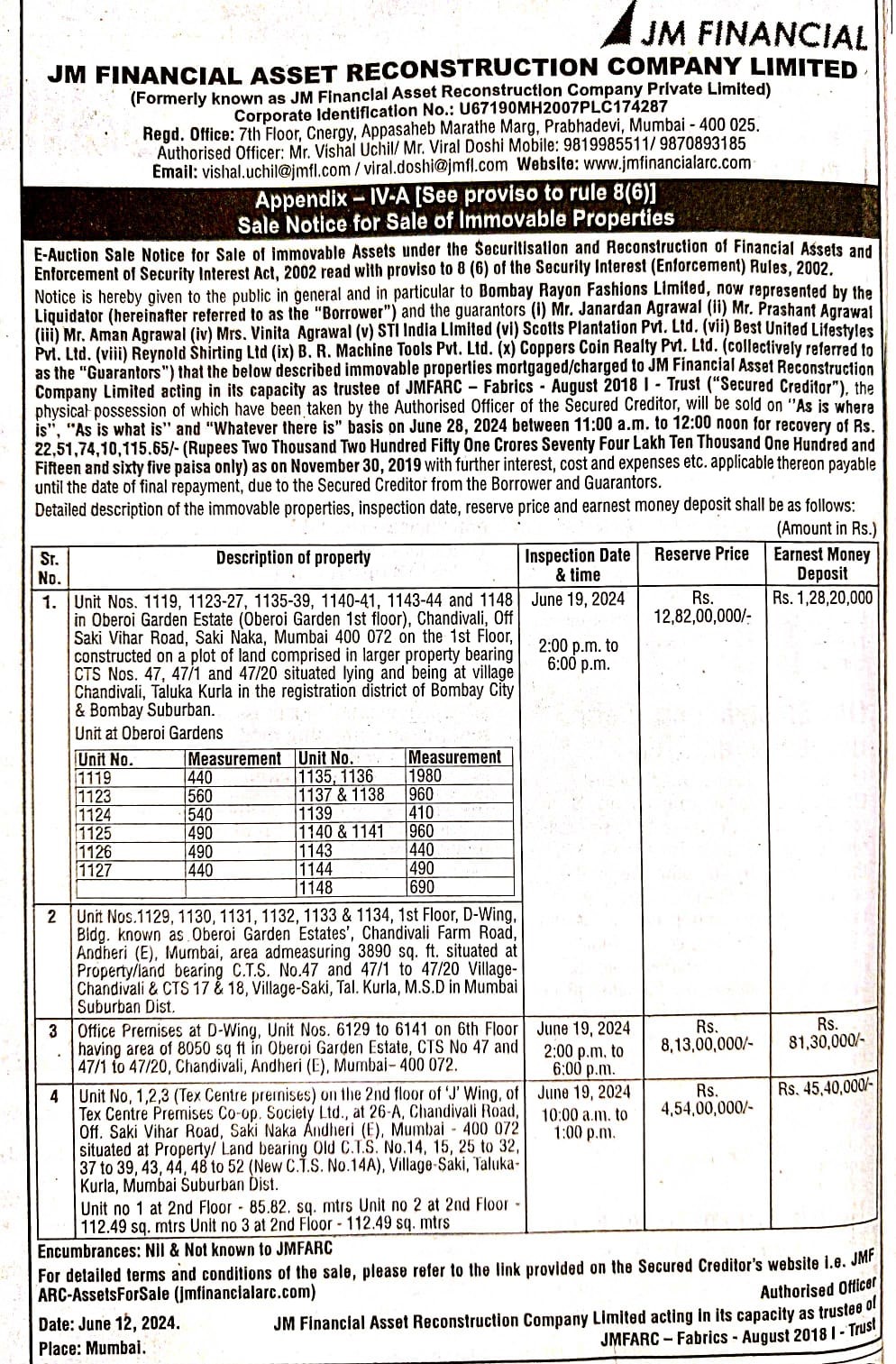| Schedule of Property: | Commercial Unit 1. Unit Nos. 1119, 1123-27, 1135-39, 1140-41, 1143-44 and 1148 in Oberoi Garden Estate (Oberoi Garden 1st floor), Chandivali, Off Saki Vihar Road, Saki Naka, Mumbai 400072 on the 1st Floor, constructed on a plot of land comprised in larger property bearing CTS Nos. 47, 47/1 and 47/20 situated lying and being at village Chandivali, Taluka Kurla in the registration district of Bombay City & Bombay Suburban.Unit at Oberoi Gardens :Unit No.1119, Measurement - 440, Unit No.1123, Measurement - 560, Unit No.1124, Measurement - 540, Unit No.1125, Measurement - 490, Unit No.1126, Measurement - 490, Unit No.1127, Measurement - 440, Unit No.1119, Measurement - 440, Unit No.1135, 1136, Measurement - 1980, Unit No.1137 & 1138, Measurement - 960, Unit No.1139, Measurement - 410, Unit No.1140 & 1141, Measurement - 960, Unit No.1143, Measurement - 440, Unit No.1144, Measurement - 490, Unit No.1148, Measurement - 690.2. Unit Nos. 1129, 1130, 1131, 1132, 1133 &; 1134, 1st Floor, D-Wing, Bldg. known as Oberoi Garden Estates', Chandivali Farm Road, Andheri (E), Mumbai, Area admeasuring 3890 sq. ft. situated at Property/land bearing C.T.S. No.47 and 47/1 to 47/20 Village- Chandivali & CTS 17 &8, Village-Saki, Tal. Kurla, M.S.D in Mumbai Suburban Dist. |