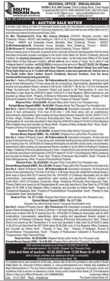 | Schedule of Property: | Item No.5 Name of Property Owner Mrs Thankamma VK Description of property All that part and parcel of land admeasuring 8. 15 Ares (3.29 Ares + 4.86 Ares) along with commercial building having a plinth area of about 600 Sq Ft bearing Door No XXVIII/280 of Chalakudy Municipality and all other constructions, improvements easementary rights existing and appurtenant thereon situated in Sy No 344/2 of Padinjare Chalakudy Village, Chalakudy (Previously Mukundapuram Taluk, Thrissur District and owned by Mrs Thankamma VK more fully described in Sale Deed No 2019/2012 dated 12.04.2012 and Sale Deed No 3877/2004 dated 29.06.2004 both of Sub Registrar Office Chalakudy and bounded as follows North Property of Taisy. East : Property of Ainikadan Thomas & Purushothaman Thuluparamban South Property of Padmanaban Kailasathi & Purushothaman Thuluparamban West Municipal Road |