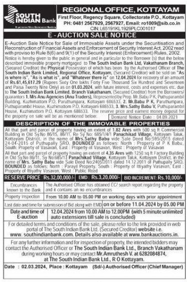 | Schedule of Property: | All that part and parcel of property having an extent of 1.82 Ares with 500 sq ft Commercial Building in Old y.No 86/15 85/11 Re Sy No 685/1/4/1 Panachikad Village Kottayam Taluk Kottayam District in the name of Mrs. Sathy Babu vide Sale Deed No 595/2015 dated 24-04-2015 of Puthupally SRO BOUNDED as follows: North Property of P K Babu, South Property of Vasavan East Property of Vasavan West Property of Vasavan All that part and parcel of property having an extent of 4.35 Ares with 1250 sq ft Factory Building in Old Sy No 86/11. Sy No:685/13 Panachikad Village, Kottayam Taluk Kottayam District in the name of Mrs. Sathy Babu vide Sale Deed No:240572011 dated 14.12.2011 of Puthupaily SRO BOUNDED as follows North Parayl Property South Property of Itiyathy Vasavan, East Property of Itiyathy Vasavan, West Public Road |