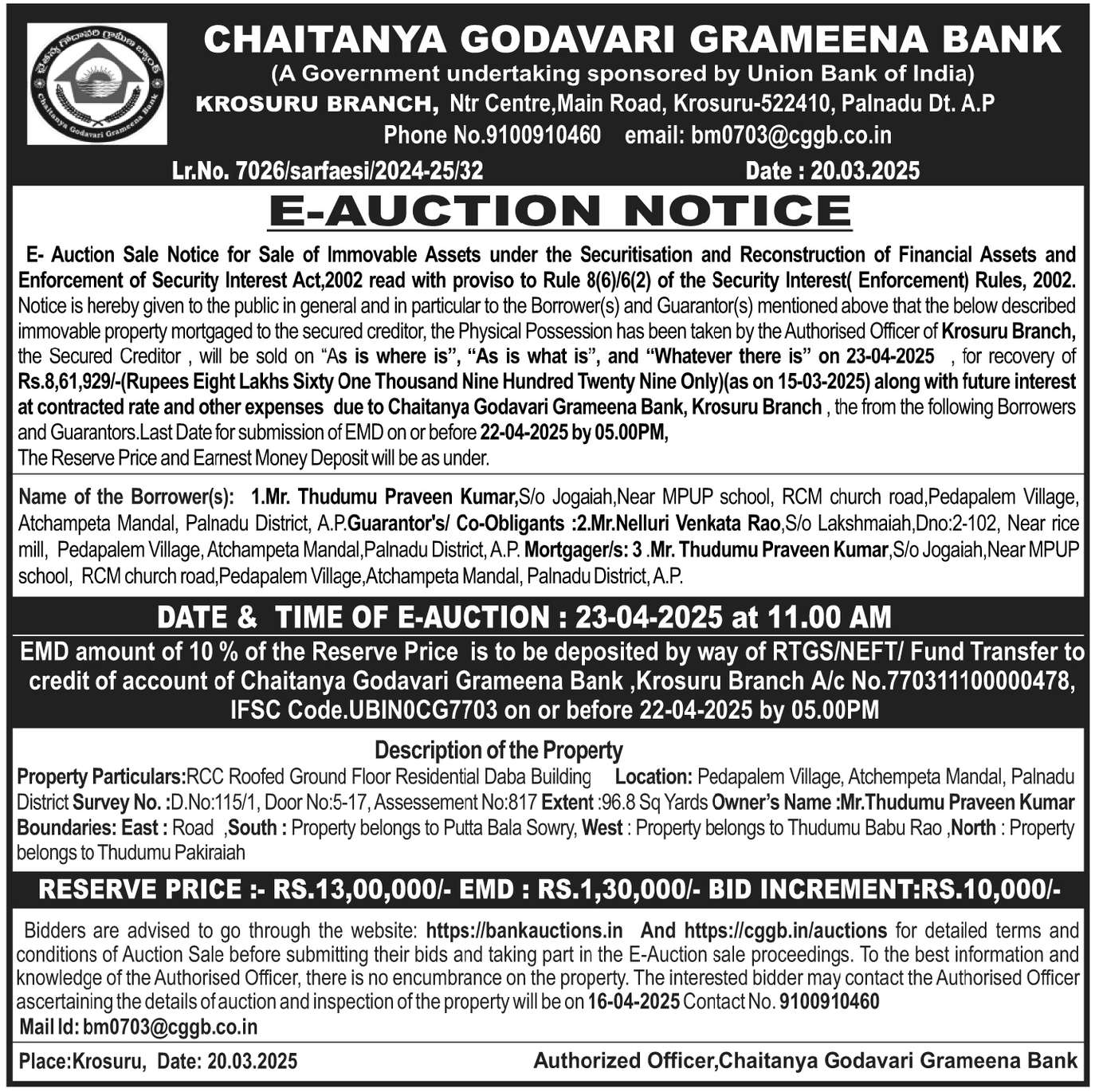 | Start Date and Time of Auction: | 23-04-2025 11:00 am |