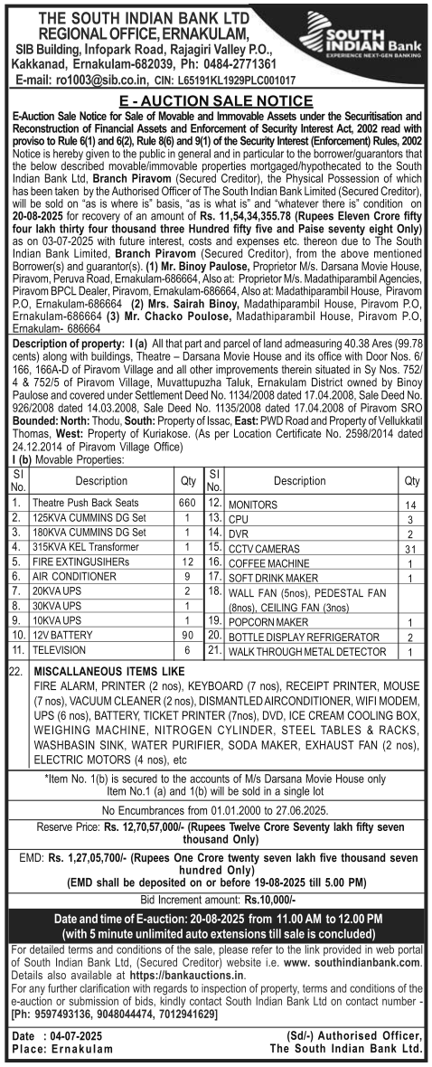 | Schedule of Property: | All that part and parcel of land admeasuring 40 38 Ares 99 78 cents along with buildings, Theatre Darsana Movie House and its office with Door Nos 6 166, 166A D of Piravom Village and all other improvements therein situated in Sy Nos 752 4 7525 of Piravom Village, Muvattupuzha Taluk, Ernakulam District owned by Binoy Paulose and covered under Settlement Deed No 1134 of 2008 dated 17 04 2008, Sale Deed No. 926 of 2008 dated 14 03 2008, Sale Deed No 1135 of 2008 dated 17 04 2008 of Piravom SRO Note, Full Details Available In Sale Notice |