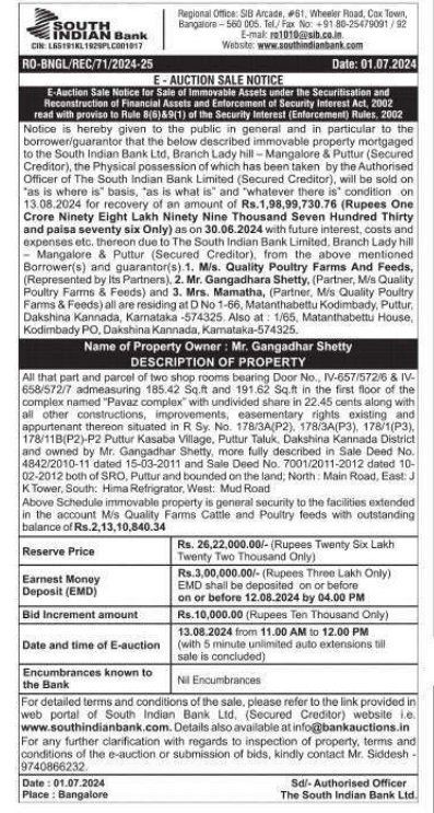| Contact Details: | Contact the Authorized Officer : Mr. Siddesh - 9740866232 & Regional Office, Bangalore, Email: ro1010@sib.co.in |