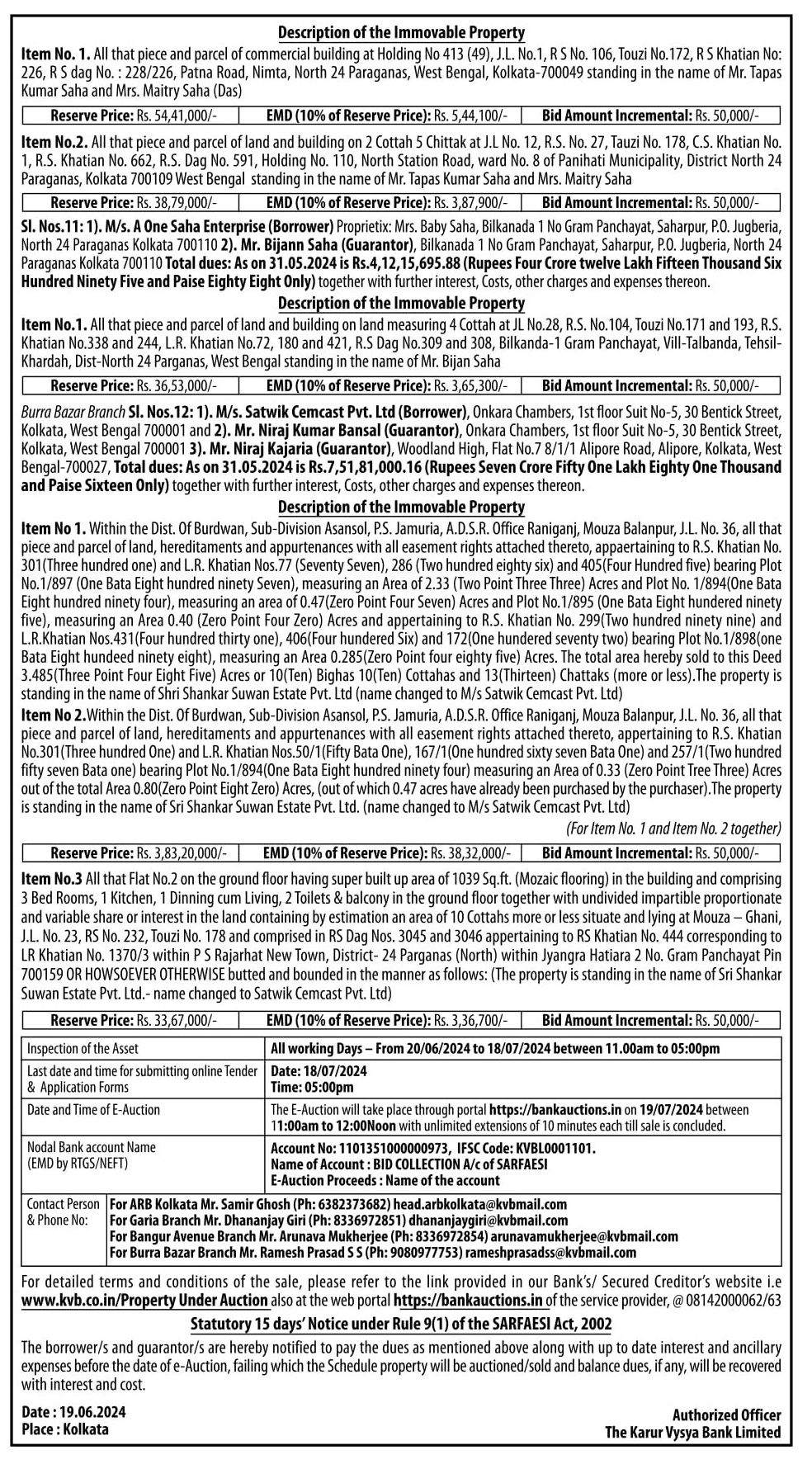 | Start Date and Time of Auction: | 19-07-2024 11:00 am |