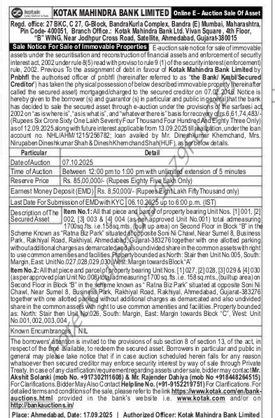 | Schedule of Property: | Item No.1: All that piece and parcel of property bearing Unit Nos. [1] 001, [2] 002, [3] 003 & [4] 004 (as per approved Unit No.001) total admeasuring 1700sq.fts. ie.158sq.mts. (built up area) on Second Floor in Block "B" in the Scheme Known as "Ratna Biz Park" situated at opposite Soni Ni Chawl, Near Sumel 8, Business Park, Rakhiyal Road, Rakhiyal, Ahmedabad, Gujarat-383276 together with one allotted parking without additional charges as demarcated and also undivided share in the common assets with right to use common amenities and facilities. Property bounded as North: Stair then Unit No.005, South: Margin, East: Unit No.027,028,029,030, West: Margin towards Block "A" Item No.2: All that piece and parcel of property bearing Unit Nos. [1] 027, [2] 028, [3] 029 & [4] 030 (asper approved plan Unit No.008) total admeasuring 1700 sq.fts. i.e. 158 sq.mts., (built up area) on Second Floor in Block "B" in the scheme known as Ratna Biz Park" situated at opposite Soni Ni Chawl, Near Sumel 8, Business Park, Rakhiyal Road, Rakhiyal, Ahmedabad, Gujarat-383276 together with one allotted parking without additional charges as demarcated and also undivided share in the common assets with right to use common amenities and facilities. Property bounded as: North: Stair then Unit No.026, South: Margin, East: Margin towards Block "C", West: Unit No.001,002,003,004 |
