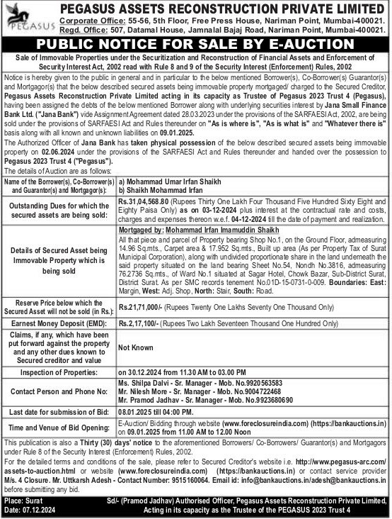 | Schedule of Property: | All that piece and parcel of Property bearing Shop No.1, on the Ground Floor, admeasuring 14.96 Sq.mts., Carpet area & 17,952 Sq.mts., Built up area (As per Property Tax of Surat Municipal Corporation), along with undivided proportionate share in the land underneath the said property situated on the land bearing Sheet No.54, Nondh No.3816, admeasuring 76.2736 Sq.mts., of Ward No.1 situated at Sagar Hotel, Chowk Bazar, Sub-District Surat, District Surat As per SMC records tenement No.01D-15-0731-0-009. Boundaries: East: Margin, West: Adj. Shop, North: Stair, South: Road. |