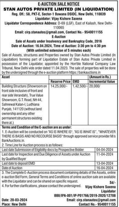 | Schedule of Property: | Building Structure (Showroom on front side inclusive of front and Showroom G.T. Road, NH 44, Sahnewal Kalan-I. Ludhiana Punjab, 141120 (without land ownership and any other permanent structures existing there at.) |