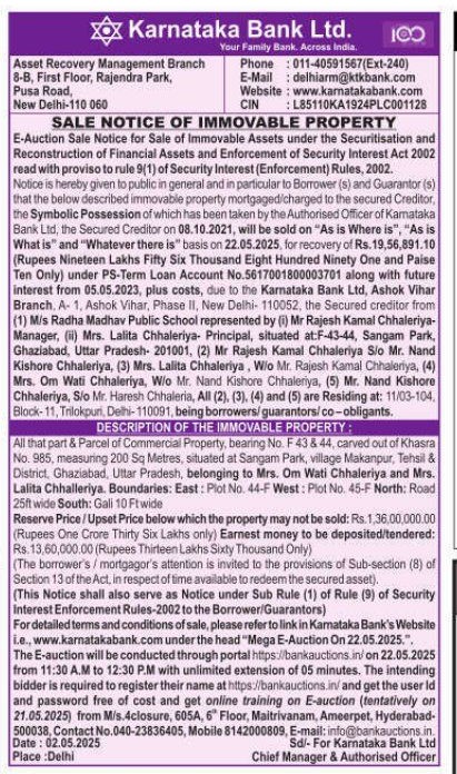 | Schedule of Property: | All that part & Parcel of Commercial Property bearing No F 43 & 44. carved out of Khasra No. 985. measuring 200 Sq Metres, situated at Sangam Park, village Makanpur, Tehsil District Ghaziabad Uttar Pradesh belonging to Mrs. Om Wati Chhaleriya and Mrs. Lalita Chhalleriya. Boundaries: East Plot No. 44-F West Plot No. 45-F North: Road 25ft wide South: Gali 10 Ft wide |