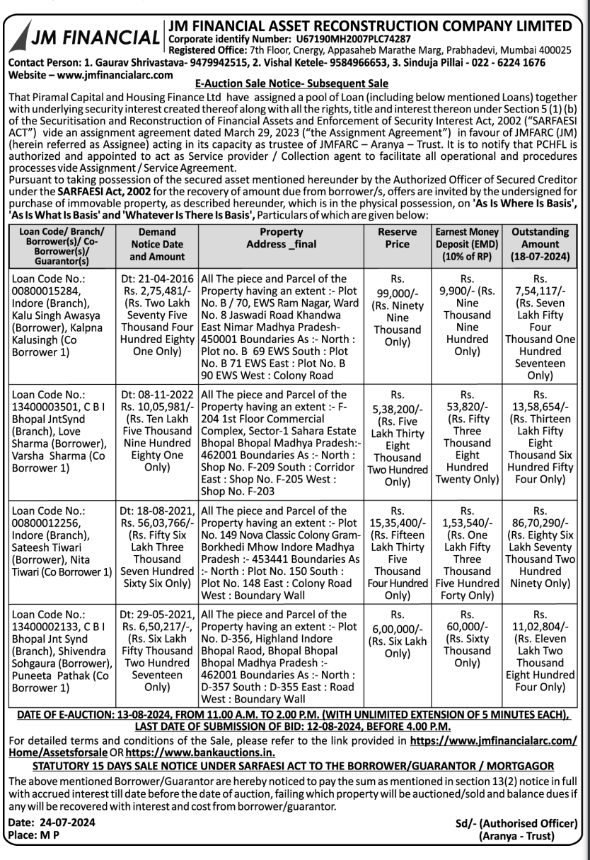 | Contact Details: | Contact The Authorized Officer: 1. Gaurav Shrivastava- 9479942515, 2. Vishal Ketele- 9584966653, 3. Sinduja Pillai - 022 - 6224 1676 Website - www.jmfinancialarc.com |