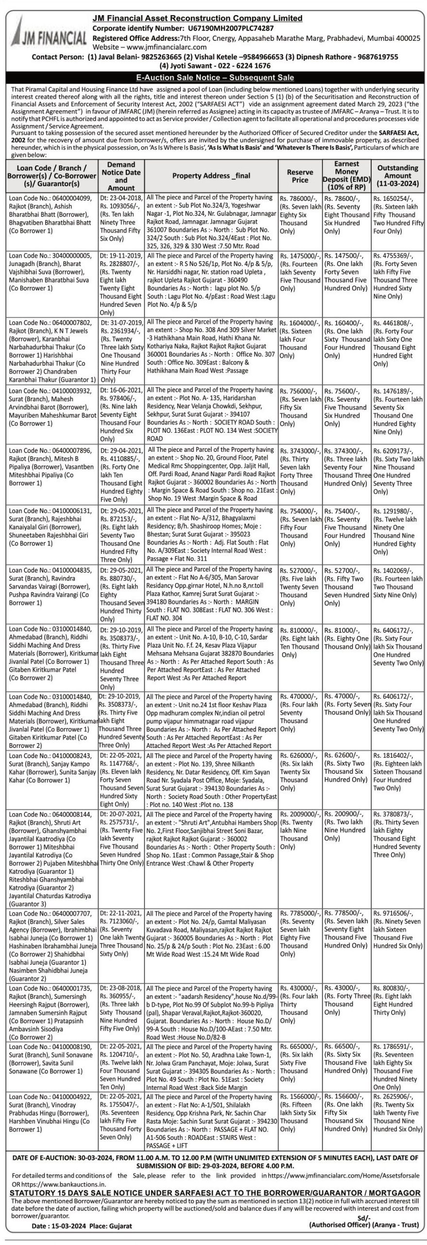 | Contact Details: | Contact The Authorized Officer: (1) Javal Belani- 9825263665 (2) Vishal Ketele -9584966653 (3) Dipnesh Rathore - 9687619755 (4) Jyoti Sawant - 022-6224 1676 |