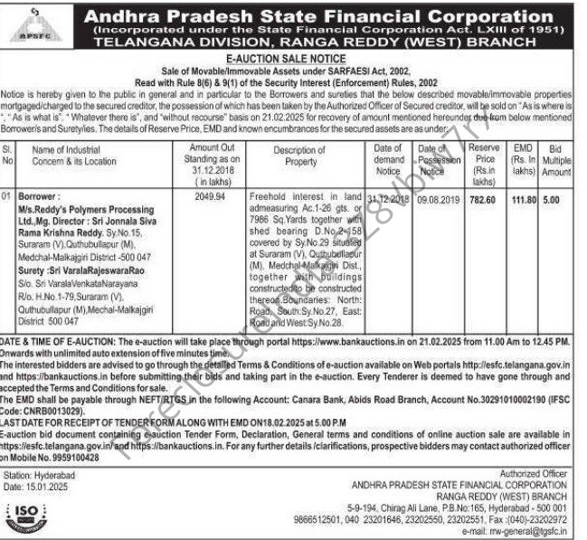 | Schedule of Property: | Freehold interest in land admeasuring Ac.1-26 gts. or 7986 Sq. Yards together with shed bearing D.No.2-158 covered by Sy.No. 29 situated at Suraram (V), Quthubullapur (M) Medchal-Malkajgiri Dist., together with buildings constructed to be constructed thereon.Boundaries: North: Road, South Sy.No.27, East: Road and West:Sy.No.28 |