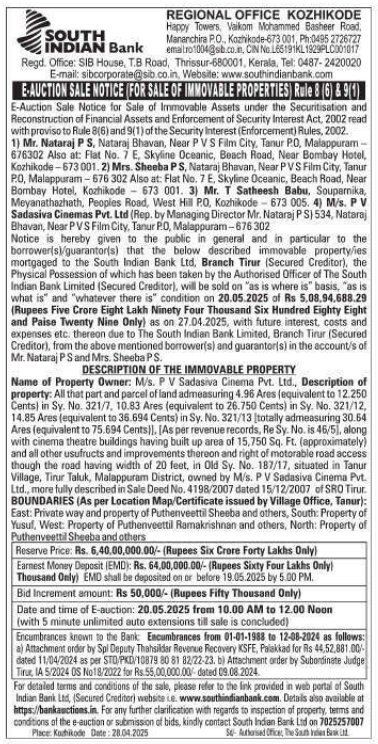 | Schedule of Property: | Name of Property Owner: M/s. PV Sadasiva Cinema Pvt. Ltd., Description of property: All that part and parcel of land admeasuring 4.96 Ares (equivalent to 12.250 Cents) in Sy. No. 321/7, 10.83 Ares (equivalent to 26.750 Cents) in Sy. No. 321/12, 14.85 Ares (equivalent to 36.694 Cents) in Sy. No. 321/13 totally admeasuring 30.54 Ares (equivalent to 75.694 Cents)], [As per revenue records, Re Sy. No. is 46/5), along with cinema theatre buildings having built up area of 15,750 Sq. Ft. (approximately) and all other usufructs and improvements thereon and right of motorable road access though the road having width of 20 feet, in Old Sy. No. 187/17, situated in Tanur Village, Tirur Taluk, Malappuram District, owned by M/s. PV Sadasiva Cinema Pvt. Ltd., more fully described in Sale Deed No. 4198/2007 dated 15/12/2007 of SRO Tirur.BOUNDARIES (As per Location Map/Certificate issued by Village Office, Tanur): East: Private way and property of Puthenveettil Sheeba and others, South: Property of Yusuf, West: Property of Puthenveettil Ramakrishnan and others, North: Property of Puthenveettil Sheeba and others |