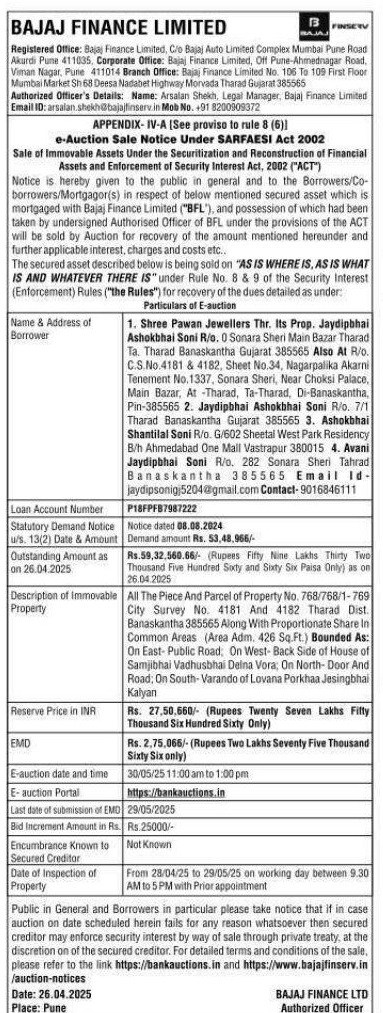 | Contact Details: | Contact The Authorized Officer: Arsalan Shekh, Legal Manager, Bajaj Finance Limited Email ID: arsalan.shekh@bajajfinserv.in Mob No. +91 8200909372 |