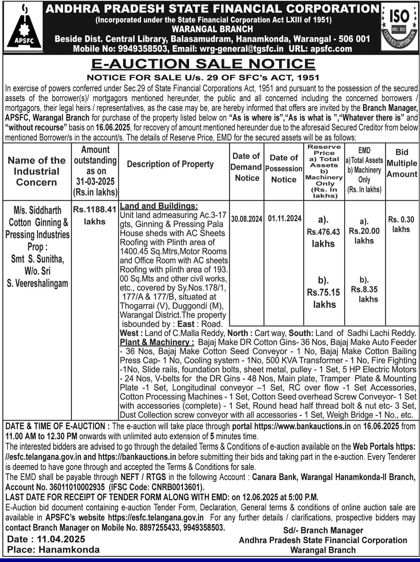 | Schedule of Property: | Land and Buildings: Unit land admeasuring Ac.3-17 gts, Ginning & Pressing Pala House sheds with AC Sheets Roofing with Plinth area of 1400.45 Sq.Mtrs, Motor Rooms and Office Room with AC sheets Roofing with plinth area of 193. 00 Sq.Mts and other civil works, etc., covered by Sy.Nos. 178/1, 177/A & 177/B, situated at Thogarrai (V), Duggondi (M), Warangal District. The property isbounded by: East: Road. West: Land of C.Malla Reddy, North: Cart way, South: Land of Sadhi Lachi Reddy. |