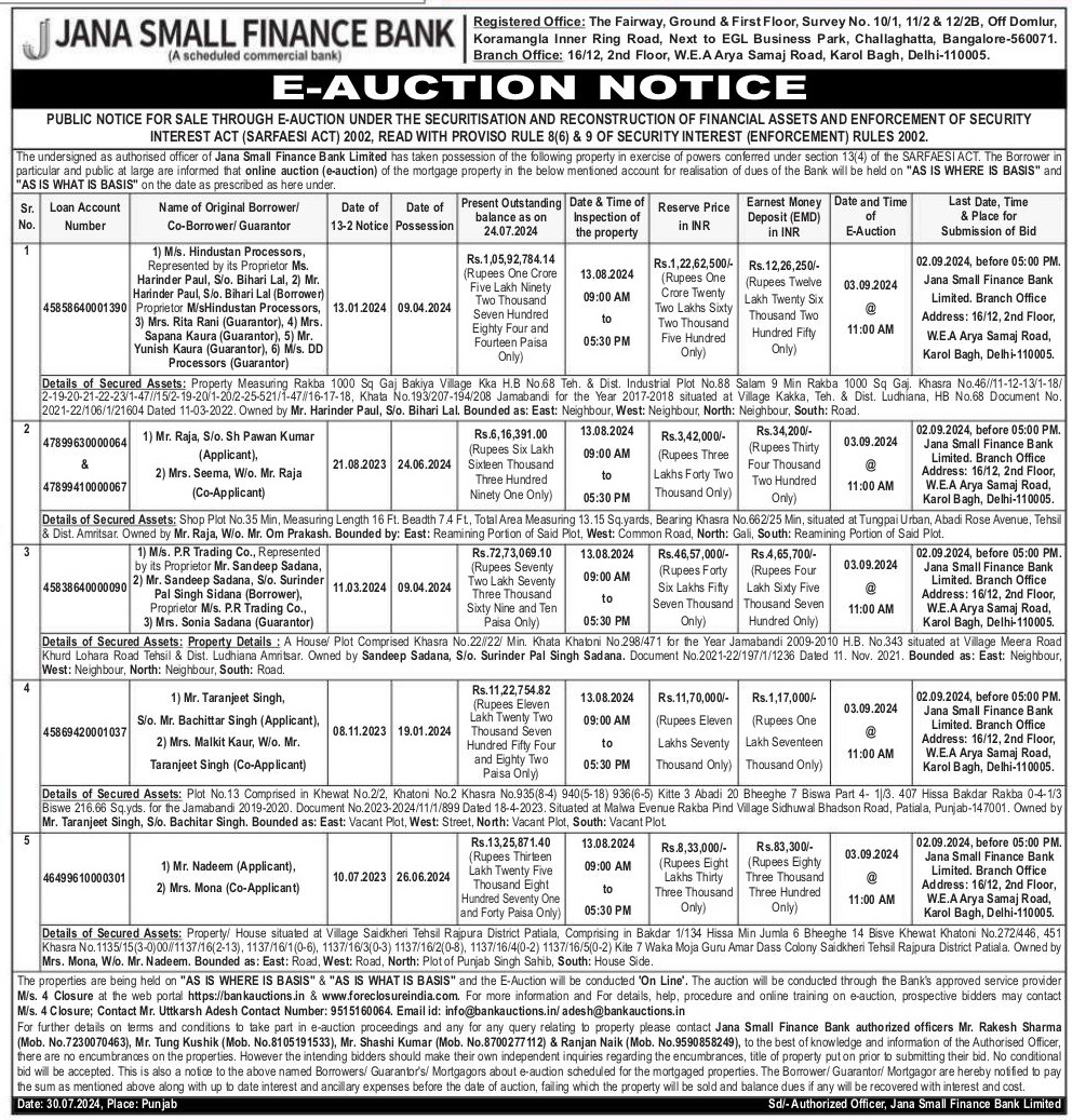 | End Date and Time of Auction: | 03-09-2024 12:00 pm |