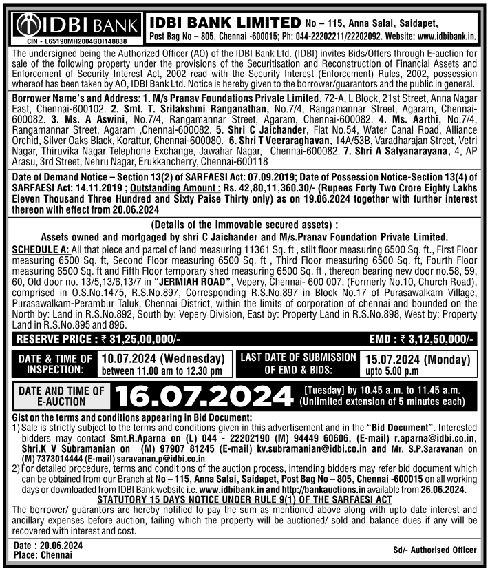 | Contact Details: | Contact The Authorized Officer : Smt R Aparna 044 - 22202190, 9444960606, Shri K V Subramanian 9790781245, Mr S P Saravanan 7373014444 |