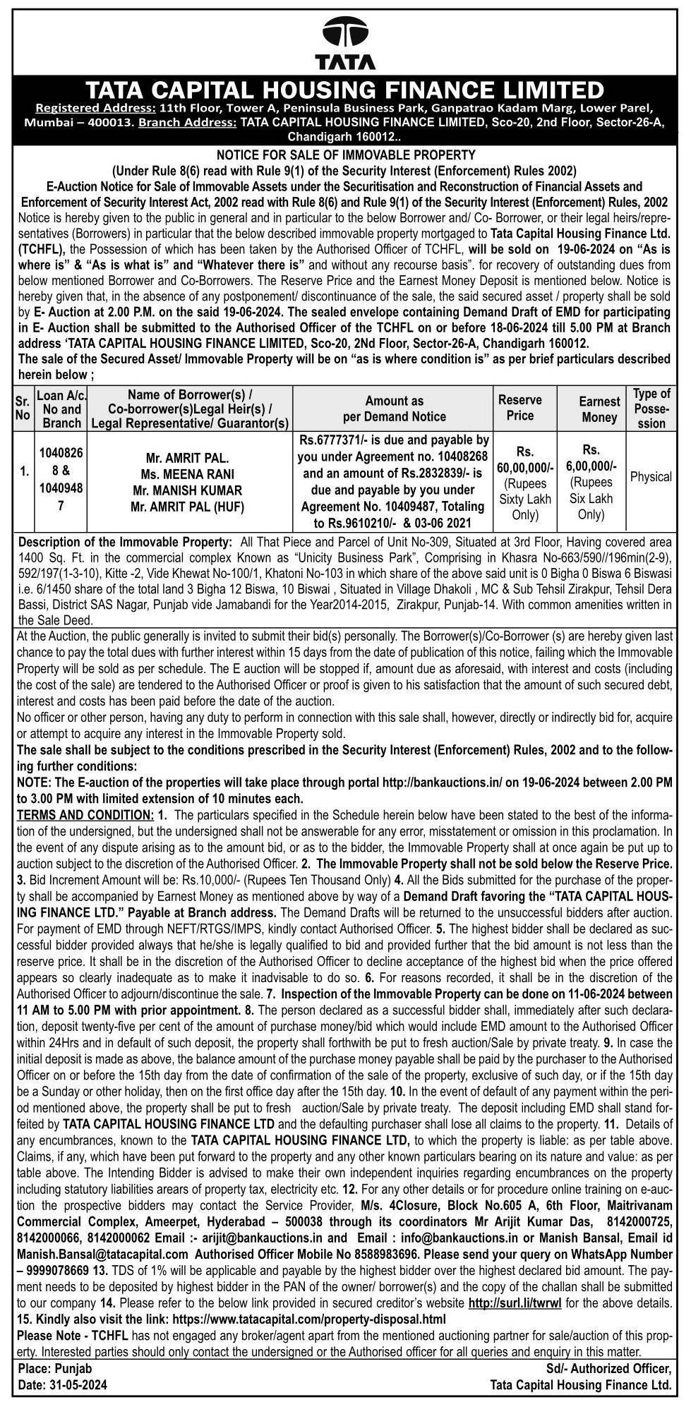 | Contact Details: | Contact the Authorized Officer:Manish Bansal Mobile No 8588983696, 9999078669 |