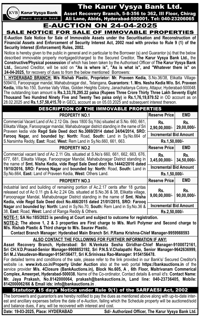 | Schedule of Property: | Commercial vacant land of Ac 2.11 Gts. situated at S.No's 660, 661, 662, 663, 676, 677, 681, Elikatta Village, Farooqnagar Mandal, Mahabubnagar District standing in the name of Smt. Nisha Kedia, vide Regd Sale Deed doct No.14442/2016 dated 19/10/2016, SRO: Farooq Nagar and bounded by: North: Road, South: Land in Sy.No.664, East: Land of Praveen Kedia, West: Others Land. |