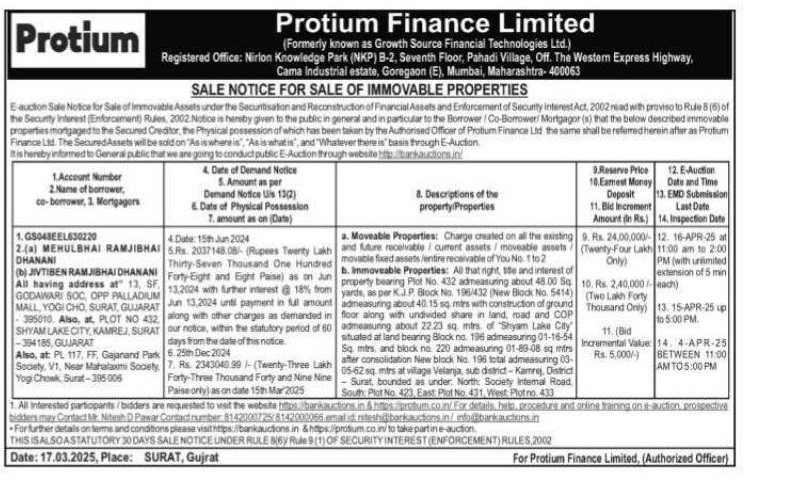 | Contact Details: | Contact The Authorized Officer : Mr Manoj Thakur: 9822396792/ Mr Dilshad : 8433508759/ Mr Ranjan Nak : 6362951653 |