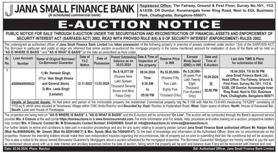 | Start Date and Time of Auction: | 19-04-2024 2:00 pm |