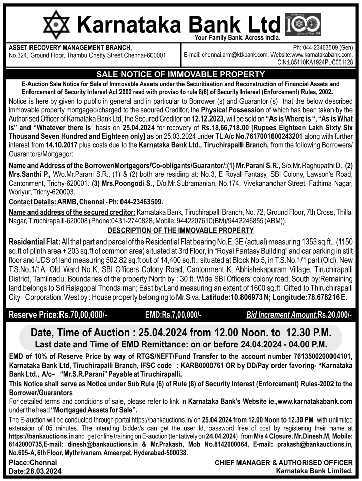 | End Date and Time of Auction: | 25-04-2024 12:30 pm |