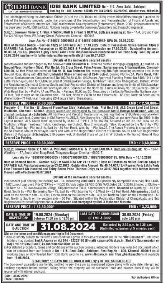 | Inspection Details: | For Inspection Contact the Authorized Officer : Smt R.Aparna 97907 81245 (E-mail)kv.subramanian@idbi.co.in |