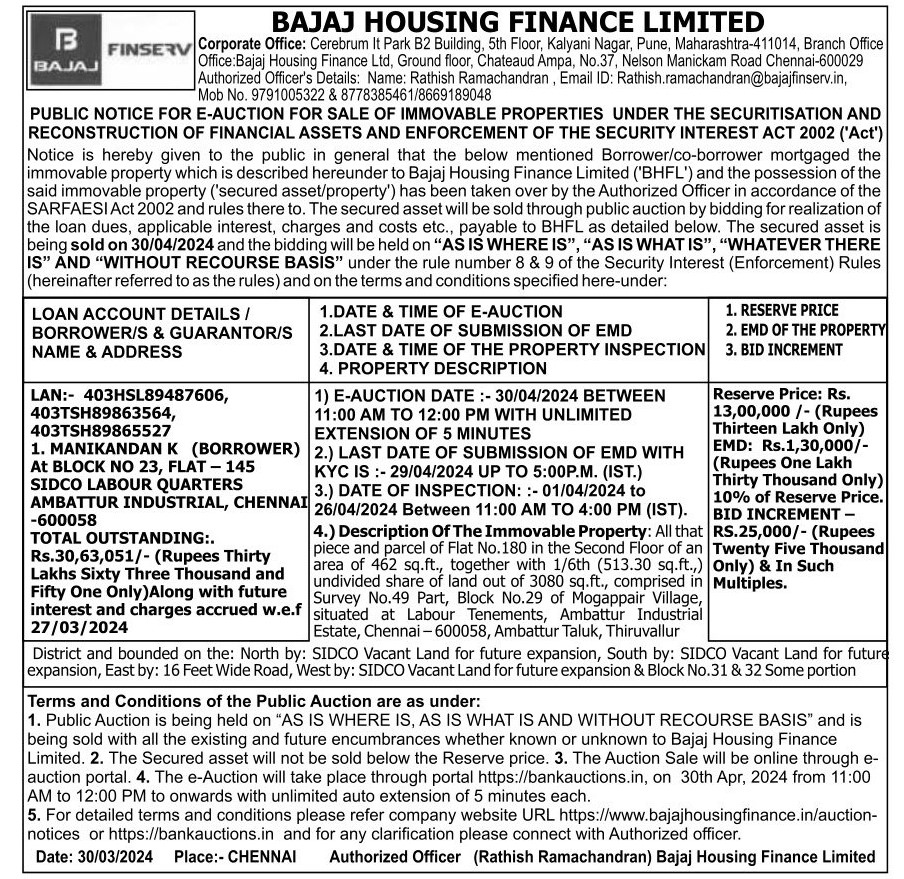 | Contact Details: | Contact Authorized Officer : Rathish Ramachandran Mob.No.:9791005322 , 8778385461 , 8669189048 |