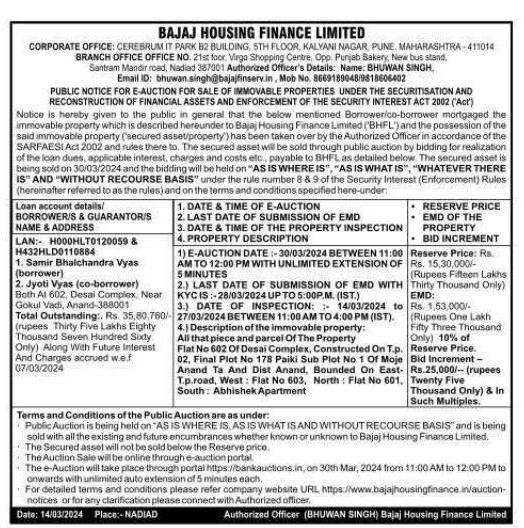 | Schedule of Property: | All that piece and parcel Of The Property Flat No 602 Of Desai Complex, Constructed On T.p. 02, Final Plot No 178 Paiki Sub Plot No 1 Of Moje Anand Ta And Dist Anand, Bounded On East- T.p.road, West: Flat No 603, North Flat No 601, South: Abhishek Apartment |