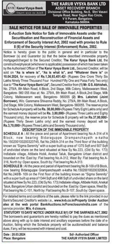 | Schedule of Property: | All the piece and parcel of Apartment bearing No B-109 of B Block now bearing Bidaraguppe Grampanchayath e-katha No.150200100200320804, flat 248/B- 109 on the First floor of the building known as "Sigma Serenity with a super built up area of 1344 Sqft and 496 Sqft of undivided share on the land situated at New Sy No 223, (Old Sy No. 173) Indlabele village, Attibele Hobli, Anekal Taluk, Bangalore Urban district and bounded on the: East by: Open space, West By: Flat bearing No.C-101, North by: Flat bearing No B-107, South by: Open space. |