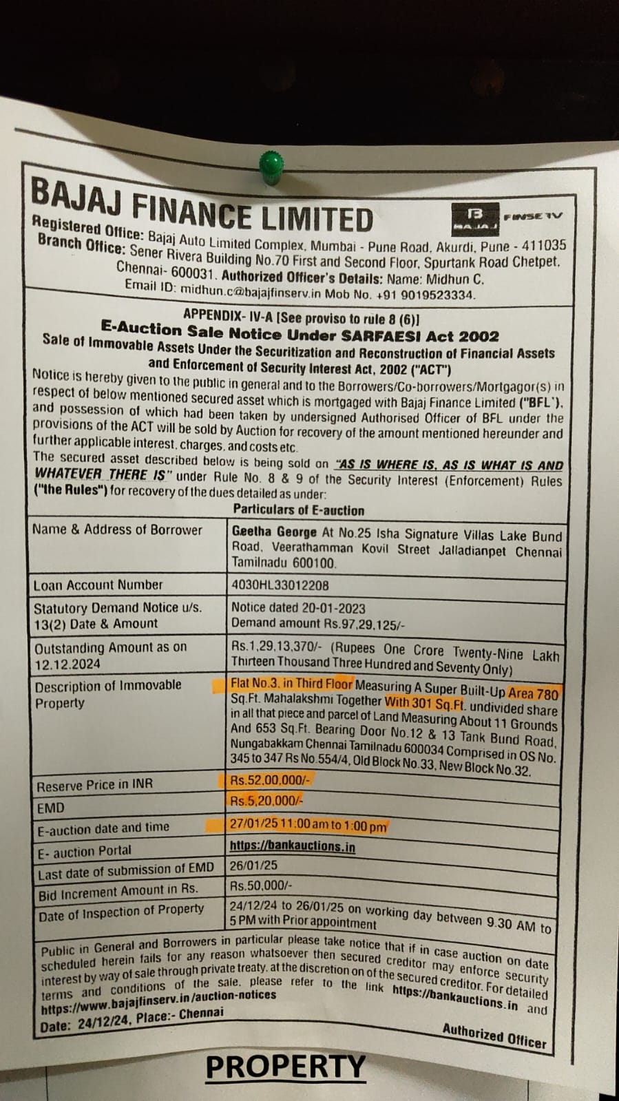 | Contact Details: | Contact The Authorized Officer: Midhun C, Email Id: midhun.c@bajajfinserv.in, Mobile No.9019523334 |