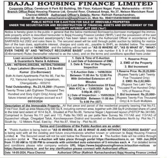 | Contact Details: | Contact The Authorized Officer's Name: Rathish Ramachandran, Email ID: Rathish.ramachandran@bajajfinserv.in Mob No. 9940155459, 8669189048 |